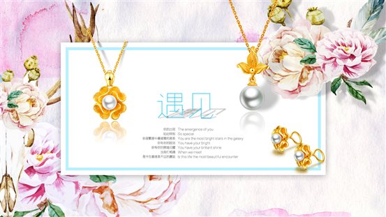 创新型的24K黄金镶嵌珍珠,款式时尚精巧,迎合了女性喜爱黄金又追求时尚的需求。皎白亮雅的珍珠与黄金交相辉映,令人耳目一新。有别于传统黄金珠宝繁复的花样,《遇见》系列款式简约、风格清新可爱,各种花草主题的灵活运用,极富时尚美感。